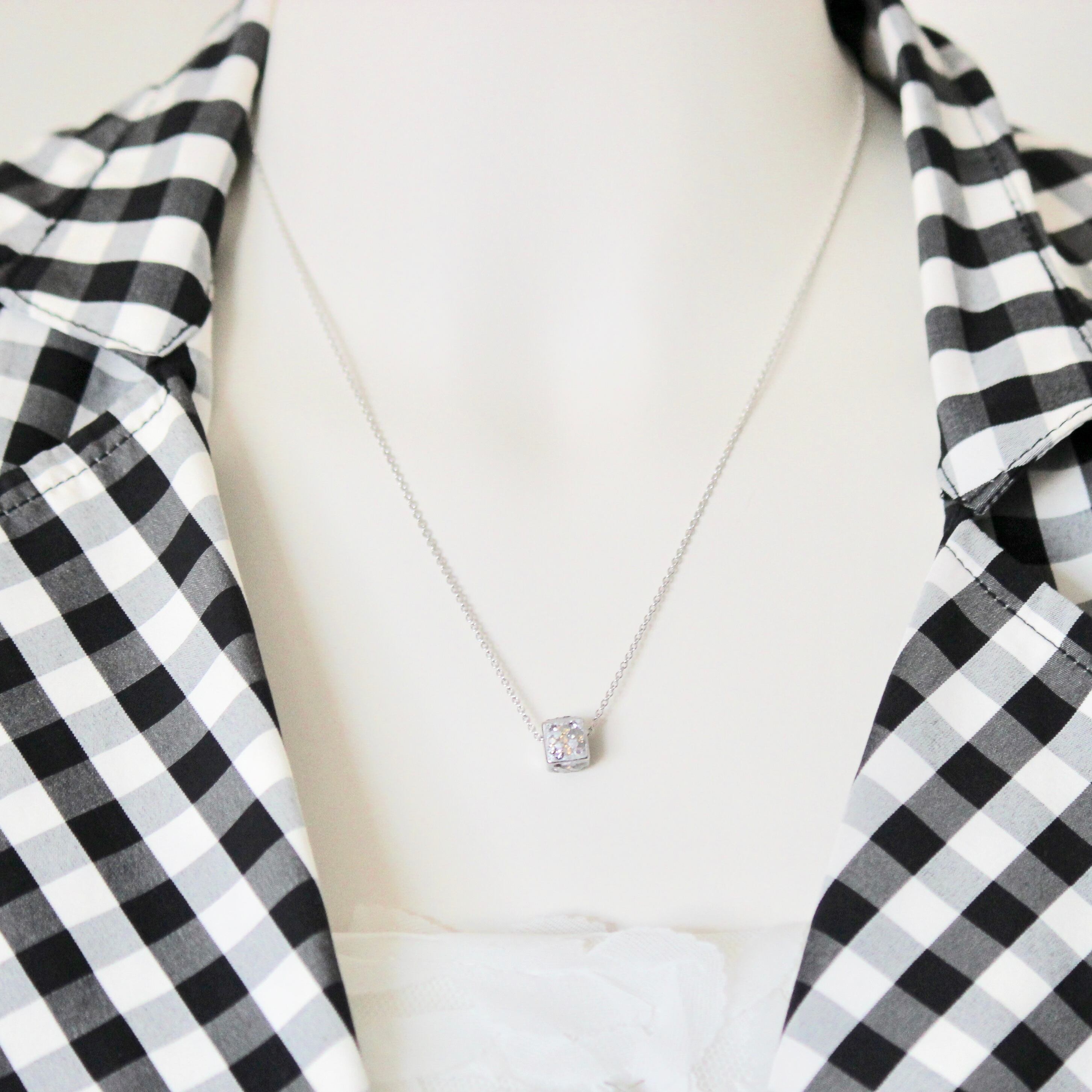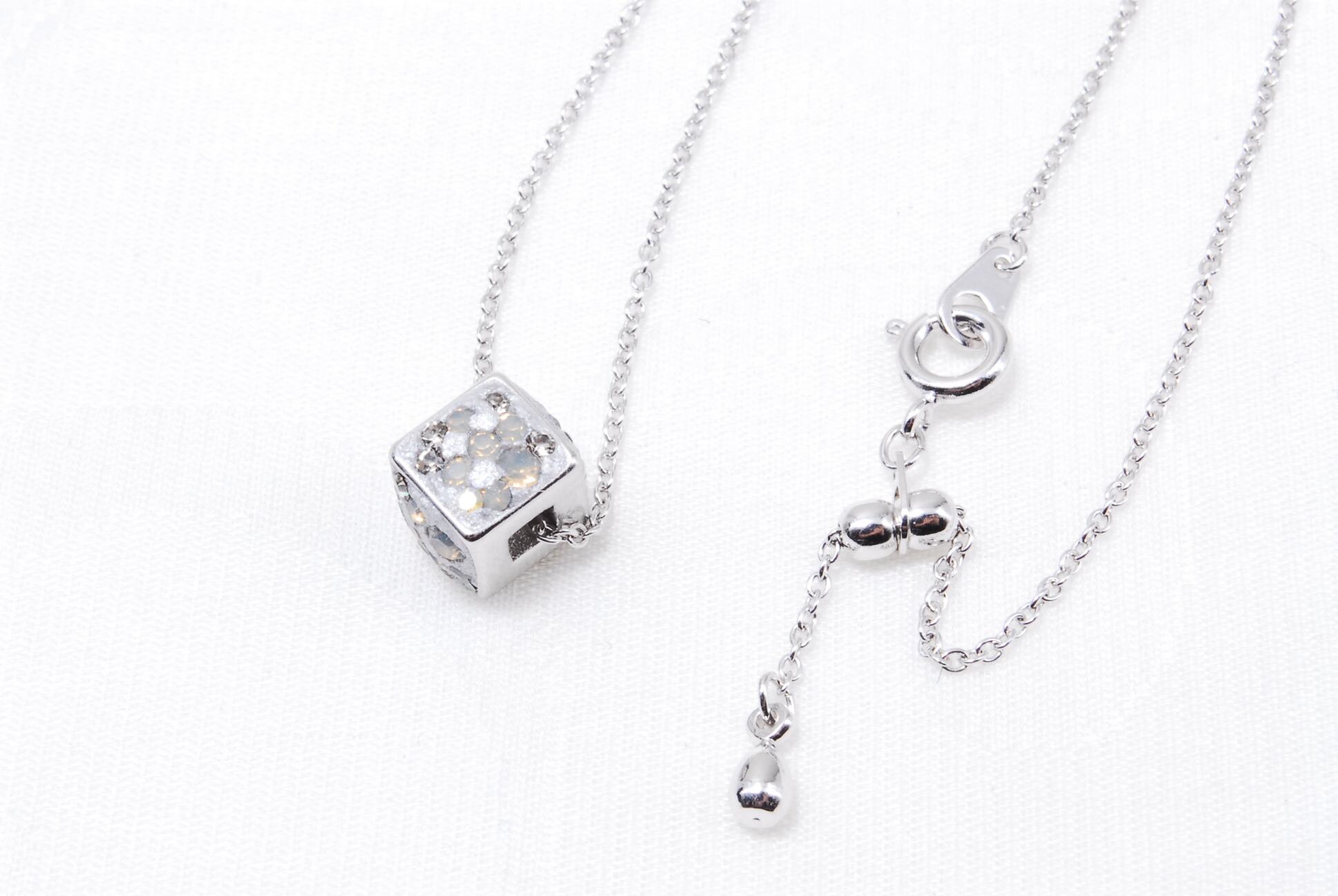 7mmキューブチャームにスワロフスキーチャトンをあしらった、キューブチャームネックレスです。