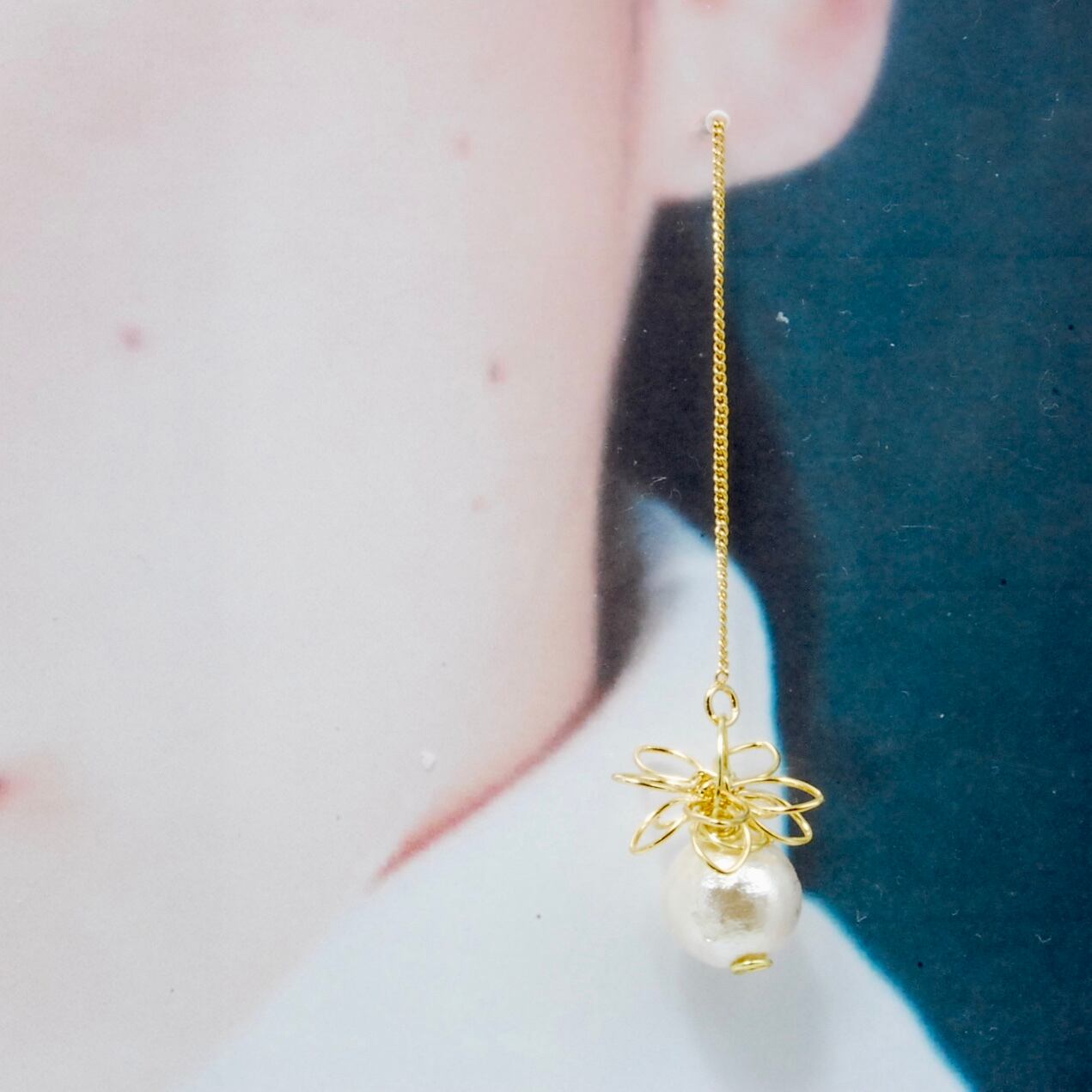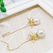 一粒パールロングチェーン*ワイヤーフラワー* ピアス/イヤリング*16金ゴールドコーティング(K16GP)
