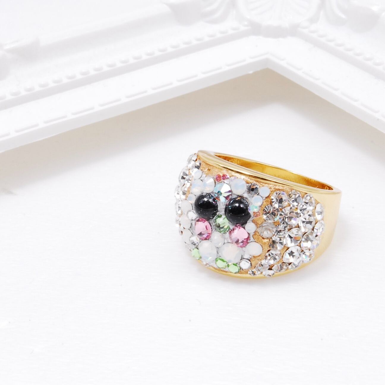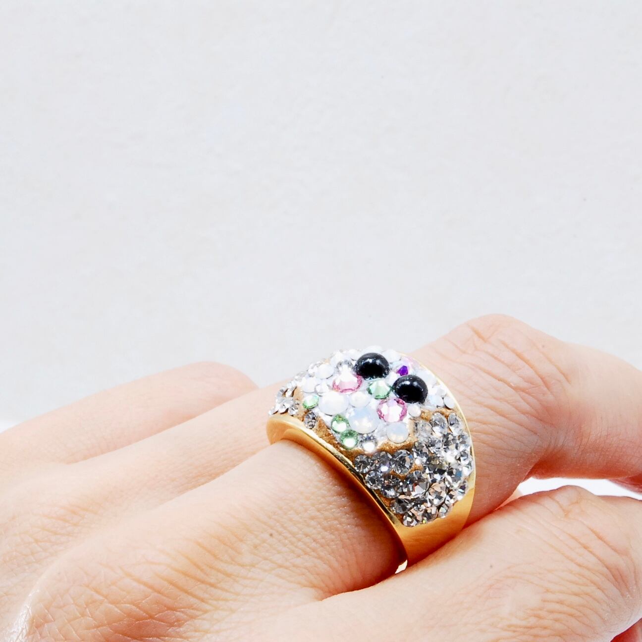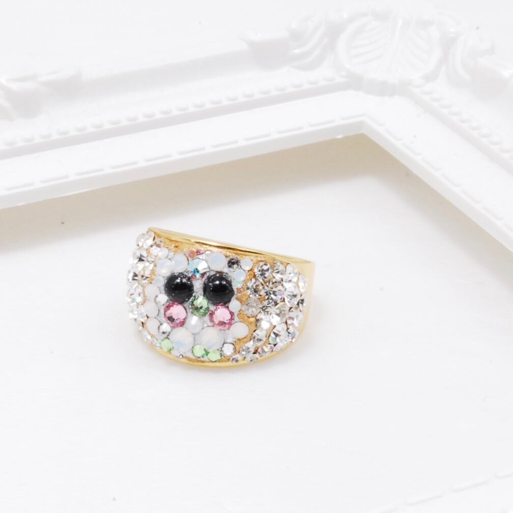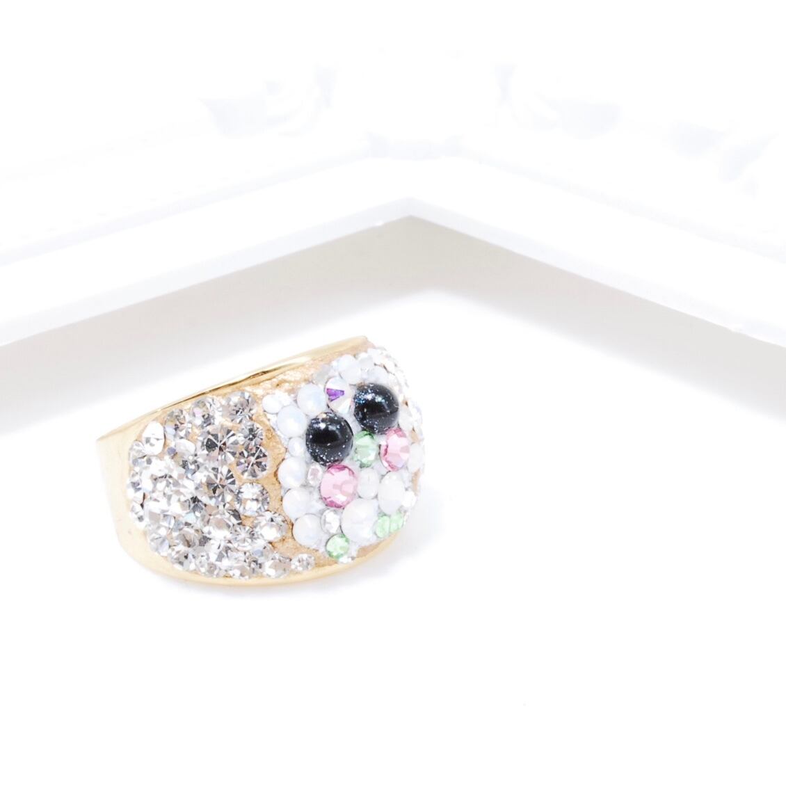 オウルの周りをクリスタルビジューで敷き詰めているので、可愛さと高級感がミックスした大人女子にぴったりのリングになりました。