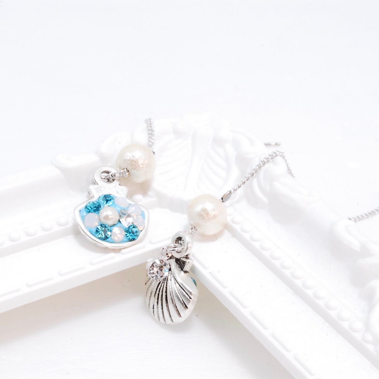 シェルのベースにクリスタルビジューとパールを埋め込みました。
