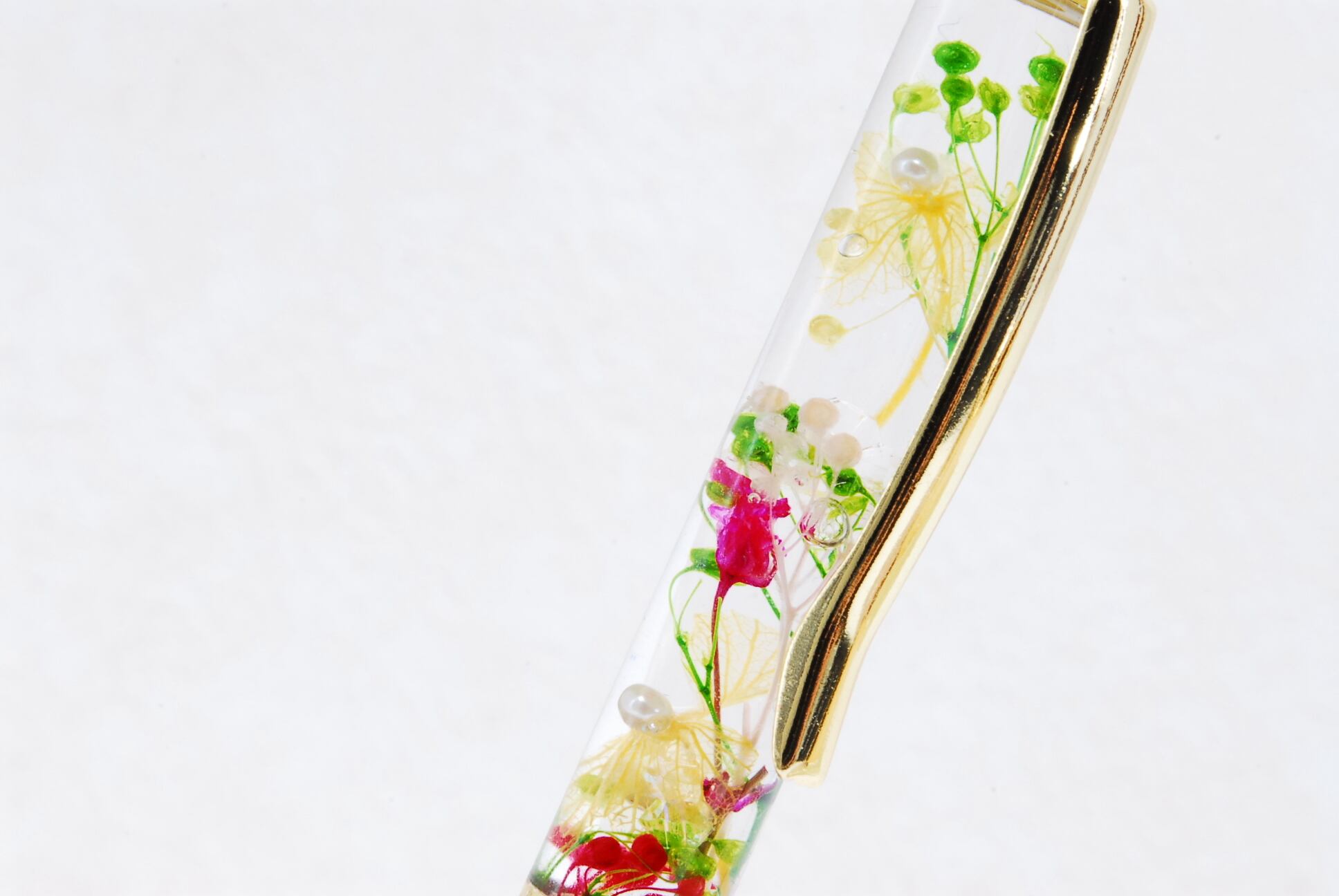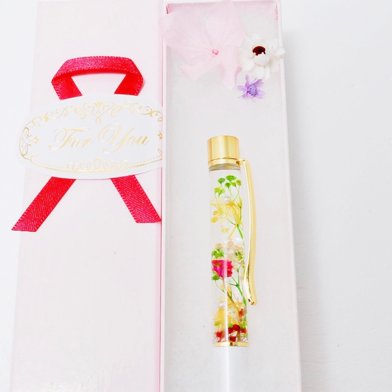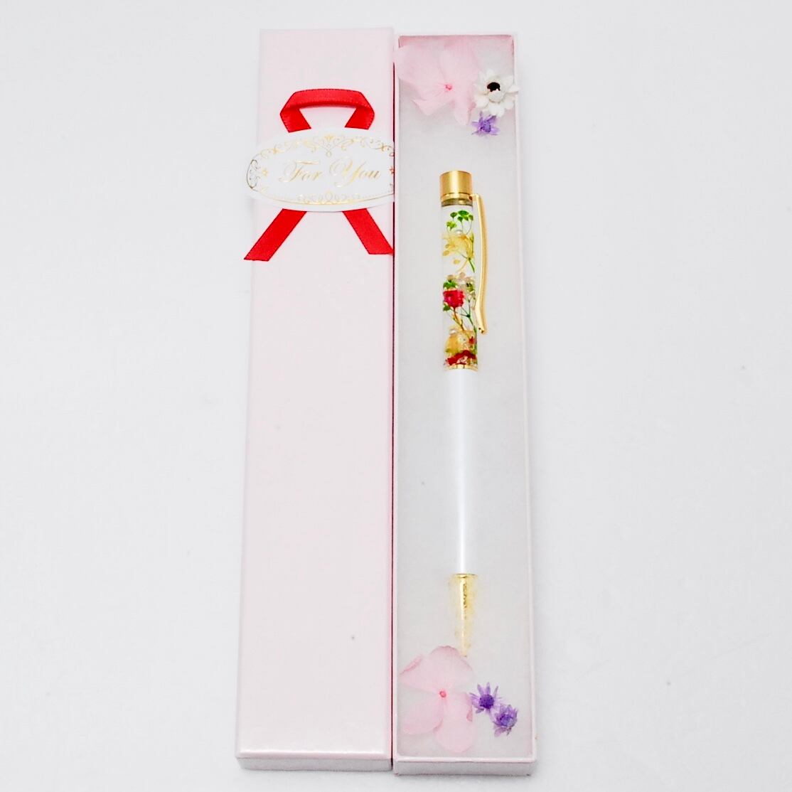 プリザーブドフラワーが、アロマオイルの中で優雅に浮遊し、お洒落で実用性のあるハーバリウムボールペンギフトになりました。