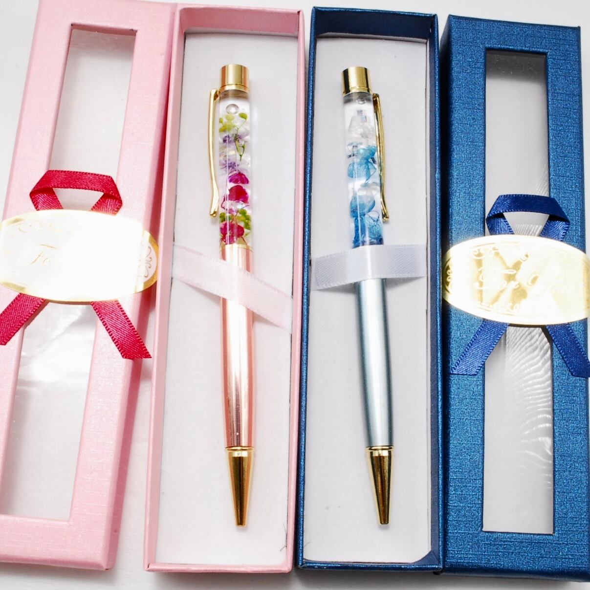 プリザーブドフラワーが、アロマオイルの中で優雅に浮遊し、お洒落で実用性のあるハーバリウムボールペンギフトになりました。
